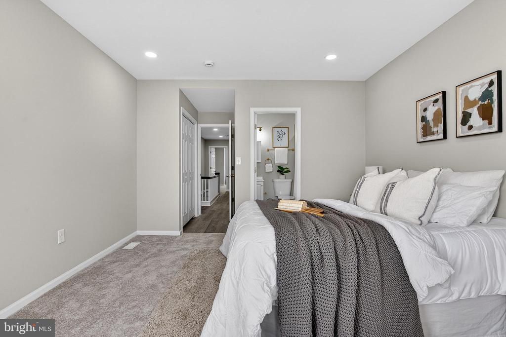 Step into this stunning, fully renovated home where contemporary design meets everyday functionality. Every inch of this property has been curated with high-end finishes and a "brand-new" feel that is ready for you to move right in. The open-concept kitchen is a showstopper, blending sleek aesthetics with premium utility. Sparkling white quartz countertops paired with a classic white subway tile backsplash and dark grout for a modern edge A full suite of stainless steel appliances, including a side-by-side refrigerator, microwave, and a range featuring a stylish blue accent panel. A deep stainless steel under-mount sink with a matte black gooseneck faucet, complemented by custom pendant lighting and elegant white cabinetry. The oversized peninsula offers a built-in breakfast bar, perfect for morning coffee or entertaining guests while you cook. The living and dining areas flow seamlessly, highlighted by trendy grey wide-plank flooring and a neutral color palette that makes the space feel bright and airy. Unique light fixtures, including a dramatic multi-cylinder glass pendant, add a touch of artistic flair. Large windows throughout the home invite an abundance of sun, highlighting the crisp, clean lines of the interior. Spacious layouts with plush, wall-to-wall carpeting for maximum comfort. Custom floor-to-ceiling marble-style tile work featuring a stunning gold honeycomb inlay and a river-rock pebble floor. High-end brushed gold fixtures, from the rainfall-style faucet to the hardware and towel racks, provide a cohesive, luxurious look. New white vanities and bright LED vanity lighting ensure a fresh start to every day. This home is a rare find, combining bold designer choices with a warm, inviting atmosphere. Schedule your tour today!